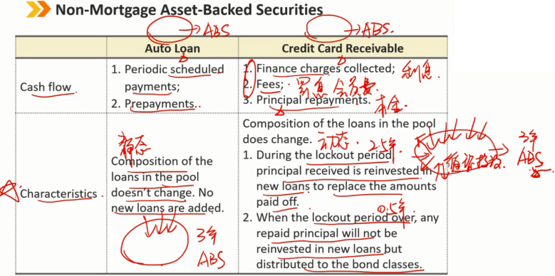 现金流构成: 车贷: 1、按事先约定定期支付的本金和利息 2、提前还款 信用卡应收款: 1、账单利息 2、逾期的罚息和会员费 3、到期归还的本金 特征: 车贷:静态资产池,贷款资产池里面的贷款组成是不变的,不会有新的贷款加入资产池 信用卡应收款: 动态资产池,贷款资产池中的贷款是循环投放的,不断更新迭代的 1、在锁定期,例如3年的ABS,前2.5年是锁定期,则这段时间收到的利息和罚息会支付给投资者,但是收到的本金会进行再投资来替换结束的信用卡贷款,实现循环投放 2、锁定期结束,最后0.5年,收回来的本金不再投放新的贷款业务,等最终到期归还投资者本金