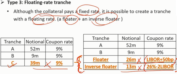 尽管抵押品经常支付固定利率,但也可以创建浮动利率的层级。(一个浮动利率 + 一个反浮动利率)