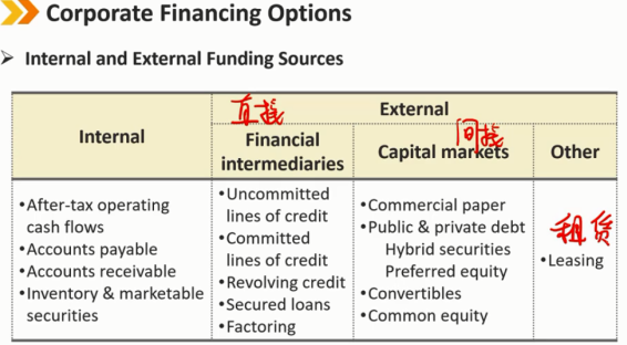 external financing,financial intermediaries,uncommitted line of credit,committed(regular) lines of credit,revolving lines of credit,capital markets,commercial paper,leasing obligation