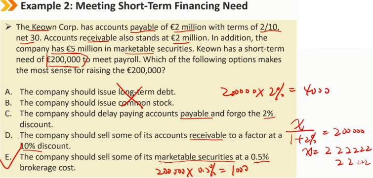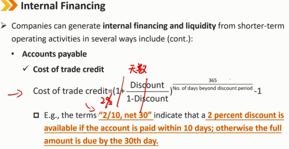 公司可以通过以下几种方式从短期经营活动中获得内部融资和流动性: 应付账款享受折扣(新考纲不要求) 贸易信贷成本 术语“2/10,net 30”表示,如果账户在10天内支付,可享受2%的折扣;否则,全额应最晚在第30天付款。