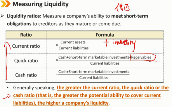 流动性比率:衡量一家公司在债权人到期或即将到期时偿还其短期债务的能力 流动比率 = (现金及现金等价物 + 应收账款 + 存货)/ 流动负债 = 流动资产 / 流动负债 速动比率 = (现金及现金等价物 + 应收账款)/ 流动负债 现金比率 = 现金及现金等价物 / 流动负债 一般来说,流动比率、速动比率或现金比率越大(即,承担流动负债的潜在能力越大),公司的流动性就越高