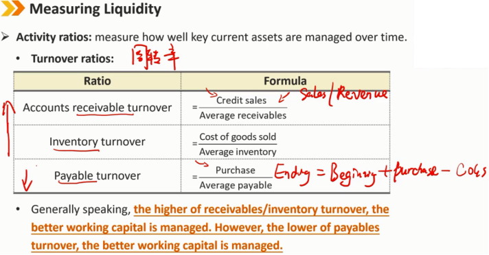 活动比率:衡量关键流动资产在一段时间内的管理情况。 周转率: 应收账款周转率 = 赊销额 / 平均应收账款 (财报中用的是总收入,因为在企业外部拿不到赊销额) 存货周转率 = 销货成本COGS / 平均存货 应付账款周转率 = 购买额 / 平均应付账款 (没给购买额时,用BASE法则,期末存货 = 期初存货 + purchase - COGS) 一般来说,应收账款周转率、存货周转率越高,营运资本管理越好。然而,应付账款周转率越低,营运资金管理越好。