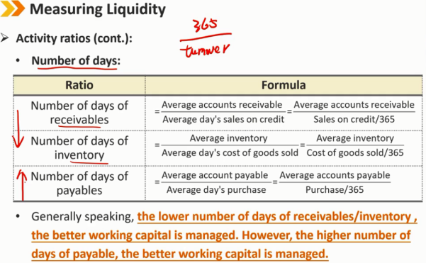 number of days of receivables,number of days of inventory,number of days of payables,operating cycle,net operating cycle(cash conversion cycle)