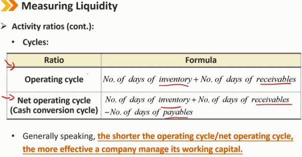 measuring liquidity,liquidity ratios,current ratio,quick ratio,cash ratio,activity ratios,accounts receivable turnover,inventory turnover,payable turnover,