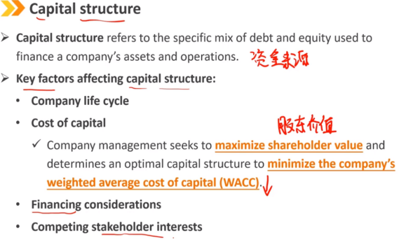 资本结构指用于为公司资产和运营提供资金的债务和股权的具体组合。