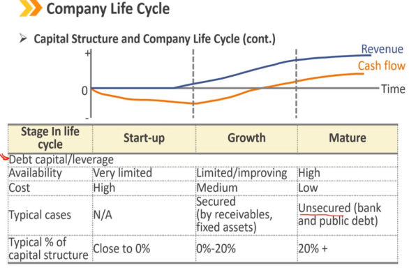 公司生命周期 公司生命周期的各个阶段——初创、成长和成熟——就像一个行业的进化阶段。 随着公司的成熟 -> 业务风险通常会下降 -> 现金流变为正、可预测 -> 更多地使用杠杆 -> 债务成为资本结构的更大组成部分。 生命周期阶段是决定资本结构的主要因素。