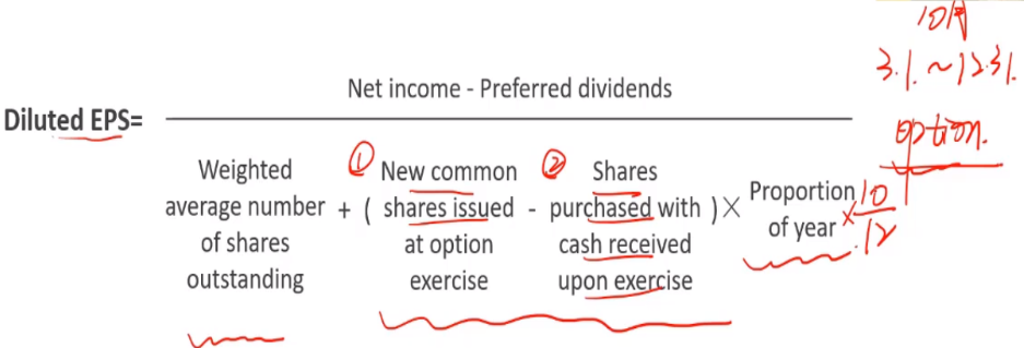 - 分母:已发行股份的加权平均数加上行权时所转换的新增股份数再减去将用转换收益所回购的股份数。