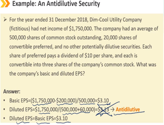 When a company has convertible preferred stock outstanding, diluted EPS is calculated using the if-converted method.(What EPS would have been if the convertible preferred securities had been converted at the beginning of the period.)