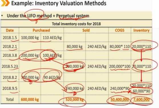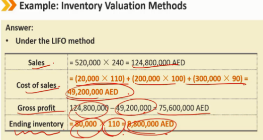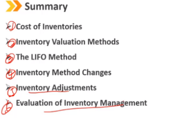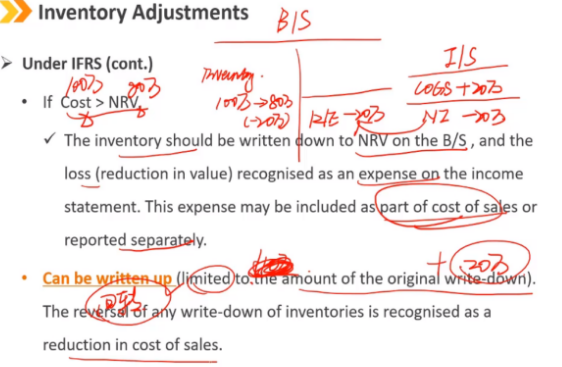 - 存货应在资产负债表上减值至NRV,损失(价值减少)在利润表上确认为费用。该费用可作为销售成本COGS的一部分或单独报告。
