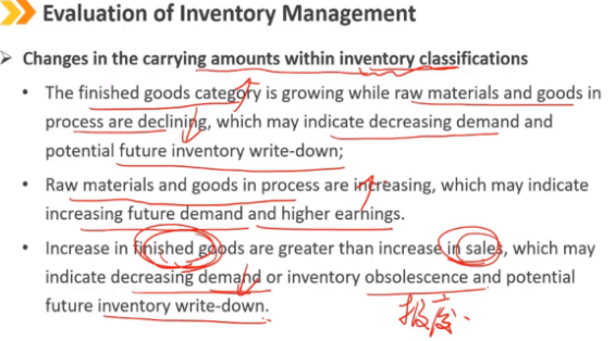 存货各类别中账面价值的变化(已完工产品、原材料、在产品的相应账面价值) - 已完工产品在增长,而原材料和在产品在下降,这可能表明市场需求在下降,未来可能出现存货减值 - 原材料和在产品增长,这可能表明未来市场需求增加,收入增加 - 已完工产品的增长大于销售额的增长,这可能表明市场需求在下降,或将出现存货报废,以及潜在的未来存货减值