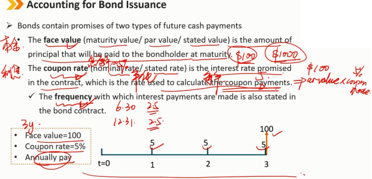 债券包含两种类型的未来现金支付承诺 本金:面值(到期日价值/票面价值/陈述价值)是到期日将支付给债券持有人的本金金额。 利息:息票利率(名义利率/规定利率)是合同中承诺的利率,是用于计算息票付款的利率,是一个年化利率。 付息频率:债券合同中还规定了支付利息的频率。