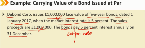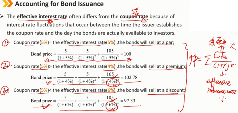 实际利率通常不同于票面利率,因为在发行人确定票面利率和债券实际可供投资者使用之间发生的利率波动。 当息票率(5%)= 有效利率(5%),债券将按票面价值平价发行 当息票率(5%)> 有效利率(4%),债券将溢价发行 当息票率(5%)< 有效利率(6%),债券将折价发行
