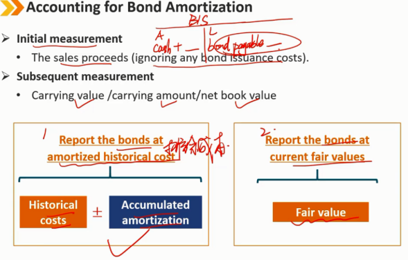 初始测量 销售收入(忽略任何债券发行成本) 后续测量 账面价值/账面金额/账面净值 1、按照债券的摊余成本报告 2、按照债券当前的公允价值报告