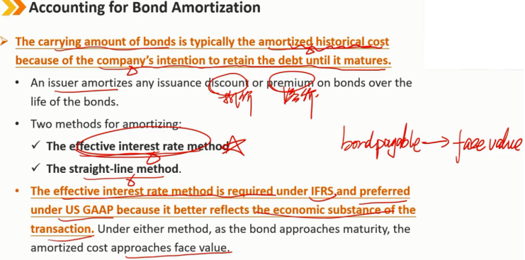 债券的账面价值通常为摊余历史成本,因为公司打算保留债务直至到期,而不是提前还款。 - 发行人在债券的有效期内摊销债券的任何发行折扣或溢价。 - 摊销的两种方法: 1、有效利率法 2、直线法 - 国际会计准则要求采用有效利率法,而美国会计准则要求优先采用有效利率法,因为它能更好地反映交易的经济实质。在这两种方法中,当债券接近到期日时,摊余成本接近债券面值。
