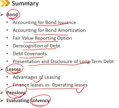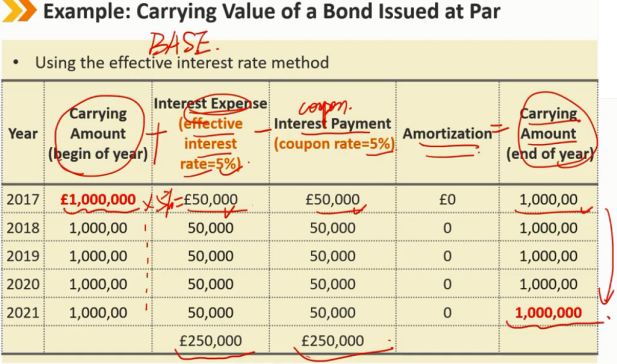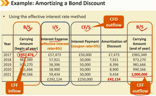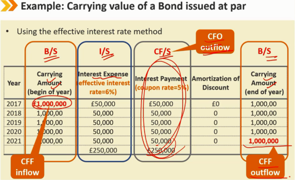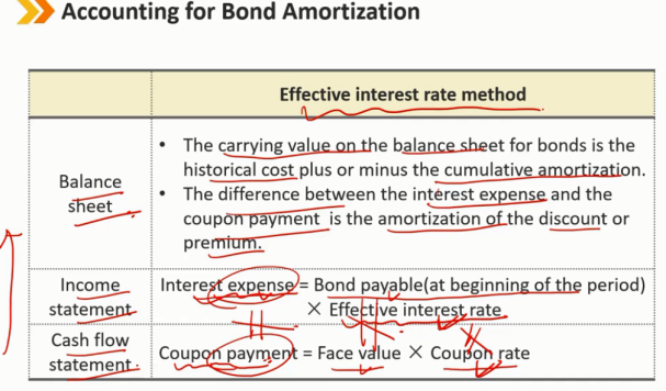 有效利率法:从下往上看 现金流量表:每年支付的费用就是 coupon payment 利润表:每年支付的利息费用是 当年期初时候的负债金额 * 融资成本的利率(有效利率) 资产负债表:如果是平价发行的债券,coupon payment = interest expense 不是平价发行时: 债券资产负债表上的账面价值是历史成本加上或减去累计摊销 利息费用和息票支付之间的差额是折价或溢价的摊销