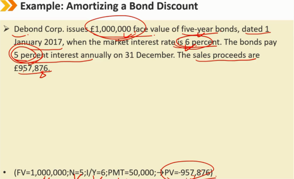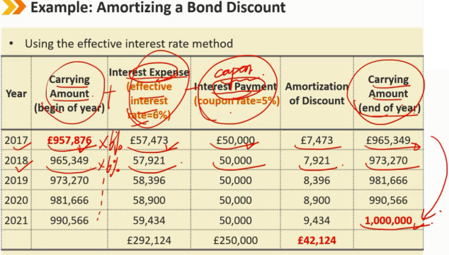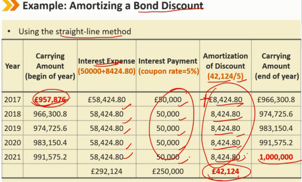 折价发行 1、知道期初 carring amount 和 期末 carrying amount 2、相减得到 总摊销费用 ,除以年份5,得到每年的摊销费用 3、coupon + 摊销费用 = 利息费用