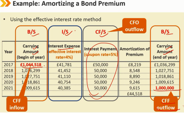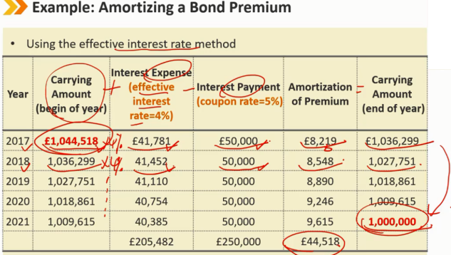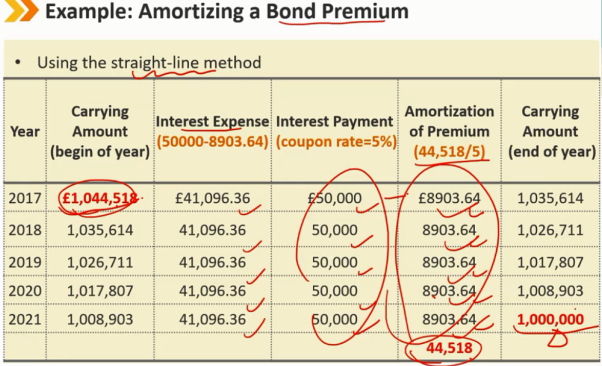 溢价发行 1、知道期初 carring amount 和 期末 carrying amount 2、相减得到 总摊销费用 ,除以年份5,得到每年的摊销费用 3、coupon - 摊销费用 = 利息费用