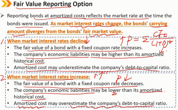 利用摊余成本报告债券的价格反映了债券发行时的市场利率。当市场利率变化的时候,债券的账面价值与债券的真实价值会产生偏差。 1、当市场利率下降时: 按固定息票率付息债券的真实价值上涨 公司的实际经济负债可能会比按历史价值计算的摊余成本要高 此时按摊余成本计算下的公司负债-资产比会被低估 2、当市场利率增长时: 按固定息票率付息债券的真实价值下降 公司的实际经济负债可能会比按历史价值计算的摊余成本要低 此时按摊余成本计算下的公司负债-资产比会被高估