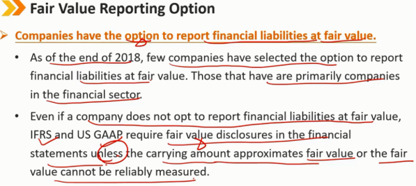 即使公司可以不选择使用真实价值报告金融负债(仍使用摊余成本报告),国际会计准则和美国会计准则都要求在财务报表中披露金融负债的真实价值,除非其账面价值和真实价值很接近或者真实价值不能被可靠的计算出来。