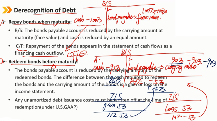 1、债券到期时偿还: 资产负债表:应付债券科目金额减少,减少的金额为到期时债券账面面值,现金科目也减少相应的金额 现金流量表:债券的偿付体现为CFF的流出 2、债券在到期日前提前偿还: 被提前偿还债券的相应账面价值从报表中抹去,提前偿还债券使现金科目减少,两者的差值在利润表中记录为一笔收益或者损失 未摊销完的债券成本必须在提前偿还时减值(美国会计准则下债券发行成本未摊销完的部分)