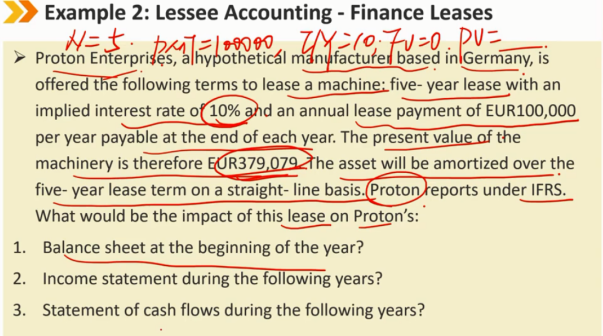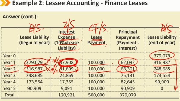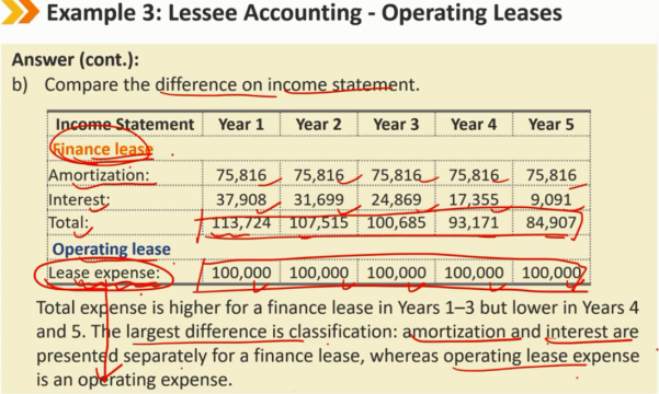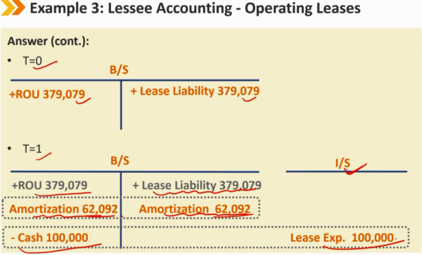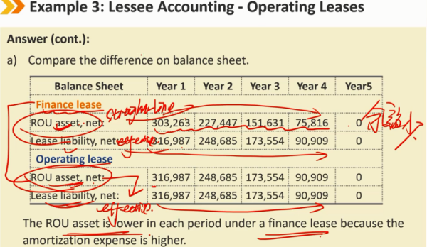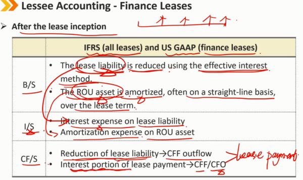 租赁后续: B/S: 租赁负债的减少使用有效利率法 ROU资产的摊销,使用直线法 I/S: 租赁负债产生一笔利息支付 ROU资产产生摊销费用 CF/S: 租赁负债本金部分的减少,算作 CFF 的流出 租金费用的利息部分,算作 CFF 或者 CFO 的流出 每年产生的租赁费用总体来说都是一样的