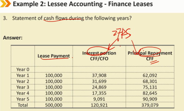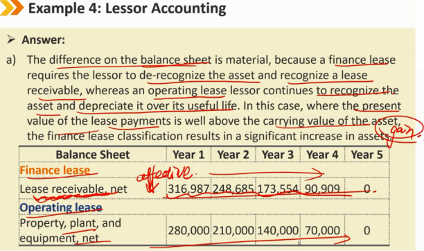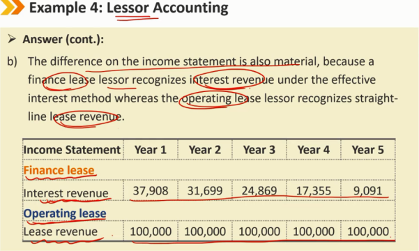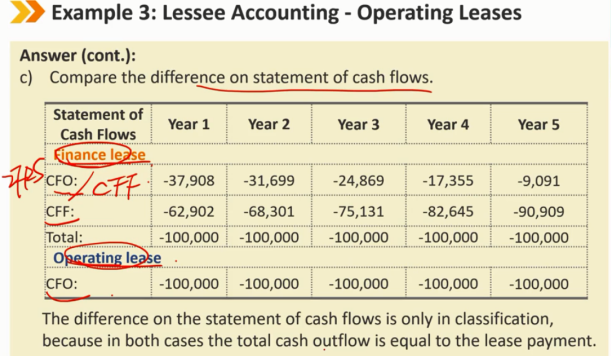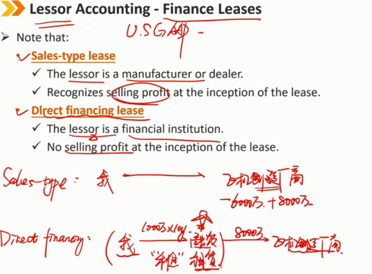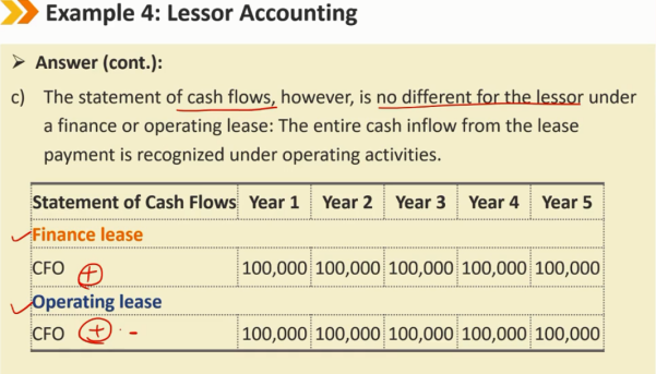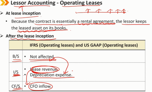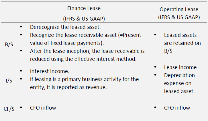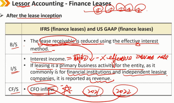 租赁后续: B/S: 应收账款采用有效利率法减少 I/S: 利息收入(承租人是利息的支出,出租人对应着是利息的收入) 如果租赁是公司的主要业务活动,如金融机构和独立租赁公司的主要业务活动,则应将其作为总收入报告 CF/S: lease payments记为CFO的流入