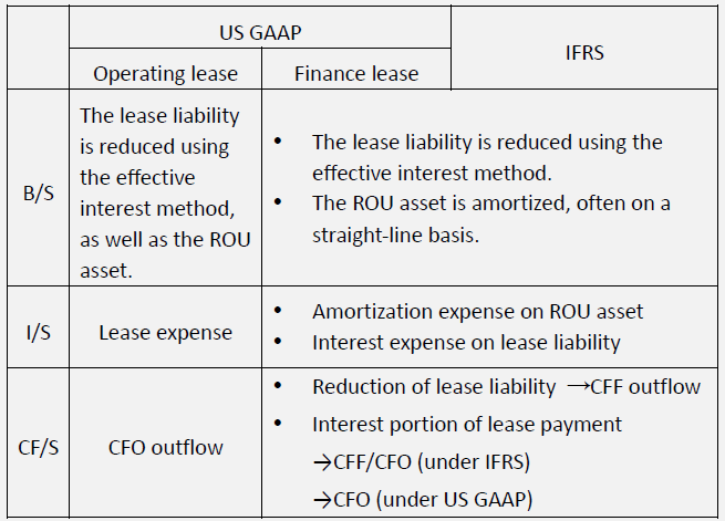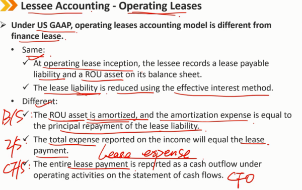 根据美国会计准则,经营租赁会计模式不同于融资租赁。 相同点: 在经营租赁开始时,承租人在其资产负债表上记录租赁应付负债和ROU资产 使用有效利率法减少租赁负债。 不同点: B/S:ROU资产进行摊销,摊销费用等于租赁负债的本金偿还,不再是使用直线摊销法。 I/S:收入中报告的总费用将等于租赁费用。 CF/S:整个租赁费用在现金流量表中作为经营活动现金流 CFO 的流出。