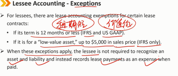 当这些例外情况适用时,承租人无需确认资产和负债,而是在支付时将租赁付款记录为一笔费用。