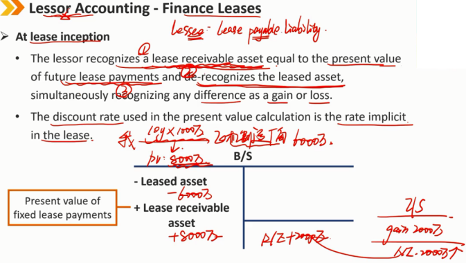 例如:我从一家飞机制造商那租赁一架价值6000万的飞机,租10年,每年支付租金1000万,租金的现值为8000万,则飞机制造商的资产负债表中将该飞机这项资产6000万抹去,同时确认一笔租赁应收资产8000万,同时利润表中记录一笔2000万的利得,NI上涨2000万,R/E同时增长2000万