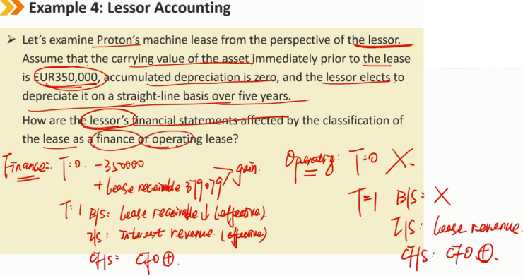 租赁开始时 由于合同本质上是一份租赁协议,出租人将租赁资产保留在其账簿上。 租赁后续: B/S: 不受影响 I/S: 租金记为租赁收入 资产正常记录折旧费 CF/S: lease revenue记为CFO的流入
