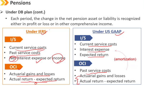 二级的学习重点 每个期间,净养老金资产或负债的变化在损益或其他综合收益中确认。 Current service costs:随着时间推移,自然增加的负债金额,员工工作越久,公司需要交的养老金越多 Past service costs:养老金计划如果发生更改时,造成的一系列变化费用 Net interest expense or income:养老金资产和养老金负债账号产生的利息收入和支出的净值 Actuarial gains and losses:因为养老金精算假设发生改变而引起的养老金计划的改变,如员工寿命变长 Actual return-expected return:实际收入和预估收入的差值