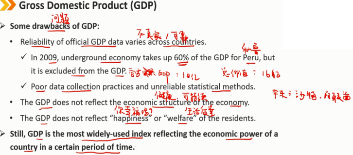 GDP的一些缺点: 各国官方GDP数据的可靠性各不相同。 2009年,地下经济占秘鲁GDP的60%,但被排除在GDP之外。 糟糕的数据收集做法和不可靠的统计方法。 GDP不能反映经济体的经济结构。 GDP并不反映居民的“幸福”或“福利” 尽管如此,GDP仍是反映一个国家在一定时期内经济实力的最广泛使用的指标。