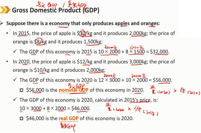 假设有一个只生产苹果和橙子的经济体: 2015年,苹果的价格为每公斤10美元,产量为2000公斤;橙子的价格为每公斤8美元,产量为1500公斤: 2015年该经济体的GDP为10×2000+8×1500=32000 2020年,苹果的价格为每公斤12美元,产量为3000公斤:橙子的价格为每公斤10美元,产量为2000公斤; 2020年该经济体的GDP为12×3000+10×2000=56000 56000美元是2020年美国经济的名义GDP 按2015年的价格计算,2020年该经济体的GDP为: 10×3000+8×2000=46000 46000美元是2020年美国经济的实际GDP