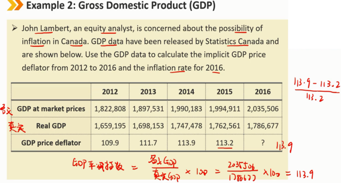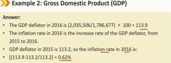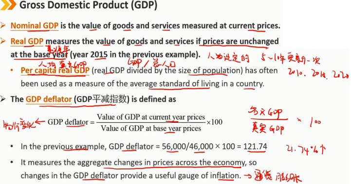 名义GDP是以当前价格衡量的商品和服务的价值。 如果价格在基准年(上例中为2015年)不变,则实际GDP衡量商品和服务的价值。 人均实际国内生产总值(实际国内生产总值除以人口规模)经常被用来衡量一个国家的平均生活水平。 GDP平减指数的定义如下: GDP deflator = 名义GDP / 实际GDP * 100 在上一个例子中,GDP平减指数=56000/46000x100=121.74 它衡量的是整个经济体价格的总体变化,因此GDP平减指数的变化提供了一个有用的通货膨胀指标。