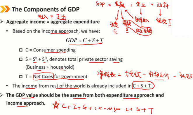 总收入 = 总支出 根据收入法,我们有: GDP = C + S + T C = 消费者支出 S = SB + SH,表示私营部门储蓄总额(企业+家庭) T = 政府净税收 注:净税收 = 税收总额 - 转移支付(已经包括在C和S里了,例如救济金)- 补贴(退税) 来自世界其他地区的收入已经包含在C+S+T中。支出法和收入法的GDP值应该相同。 C + I + G +(X-M)= C + S + T