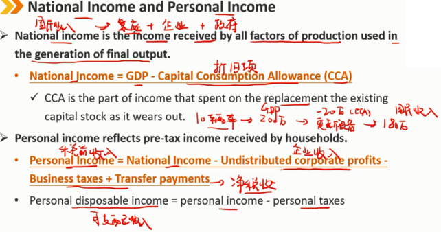 国民收入是指用于产生最终产出的所有生产要素所获得的收入。 国民收入 = GDP - 资本消费津贴(CCA) CCA是用于替换现有股本折旧之后的收入部分,即折旧项(机器的分配) 个人收入反映了家庭的税前收入。 个人收入 = 国民收入 - 未分配企业利润 - 企业税 + 转移支付 (注:企业税 - 转移支付 = 净税收) 个人可支配收入 = 个人收入 - 个人所得税