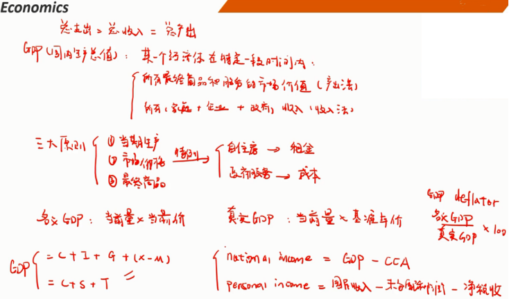 一个经济体的GDP由四个主要部门组成:家庭(人)、企业、政府和世界其他地区。 根据支出法,我们有: GDP = C + I + G +(X-M) C = 消费者在最终产品和服务上的支出 I = 国内私人投资,包括固定资本投资和存货变动(经济学上的投资与传统意义上的投资不一样,指的是固定资本投资和生产出来的存货的变动) G = 政府在消费和投资方面的支出。G = GC(政府在消费上的支出) + GI(政府在投资上的支出) X = 出口 M = 进口 X - M = 净出口