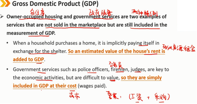 业主自用住房和政府服务是两个没有在市场上出售但仍包含在GDP计量中的服务的例子。