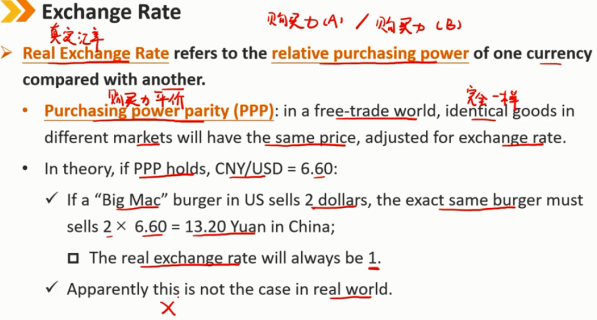 真实汇率是指一种货币与另一种货币的相对购买力。 购买力平价(PPP):在自由贸易世界中,不同市场中相同的商品将具有相同的价格,并根据汇率进行调整。 理论上,如果购买力平价成立,人民币/美元 = 6.60: 在美国,如果一个“巨无霸”汉堡卖2美元,那么对于完全相同的一个汉堡,在中国必须卖2 * 6.60 = 13.20元; 真实汇率永远是1 显然,现实世界中并非如此