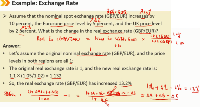 近似算法:nomial exchange rate(GBP/EUR),此时这个是△A,分母EUR的价格水平变化是△B,分子GBP的价格水平变化是△C,则有real exchange rate(GBP/EUR)的变化近似等于△A+△B-△C