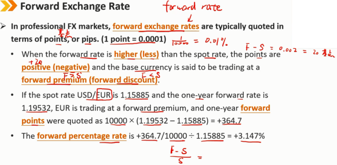 在专业外汇市场中,远期汇率通常以基点来报价。(1基点=0.0001) 当远期汇率高于(低于)即期汇率时,点数为正(负),基础货币被称为以远期溢价(远期折价)交易。 如果美元/欧元的即期汇率为1.15885,一年期远期汇率为1.19532,则欧元以远期溢价交易,一年期远期基点报价为 10000 ×(1.19532-1.15885)= +364.7 Forward points = 10000 ×(F - S) 远期百分比汇率为 +364.7/10000 ÷ 1.15885 = +3.147% 注:forward rate 多数指 forward exchange rate,也可能会指 forward percentage rate