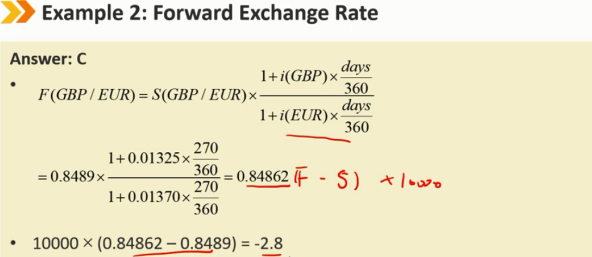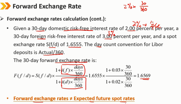 远期汇率计算(续): 30天国内无风险利率为每年2.00%,30天国外无风险利率为每年3.00%,即期汇率S(f/d)为1.6555。伦敦银行同业拆借利率(Libor)存款的日数计算惯例为 实际天数/360。 30天远期汇率为: 远期汇率 ≠ 未来的即期汇率
