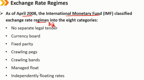 截至2008年4月,国际货币基金组织(IMF)将汇率制度分为八类: