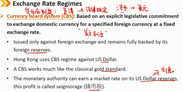 货币局制度(CBS):基于明确的立法承诺,以固定汇率将本国货币兑换为特定外币。(例如香港)