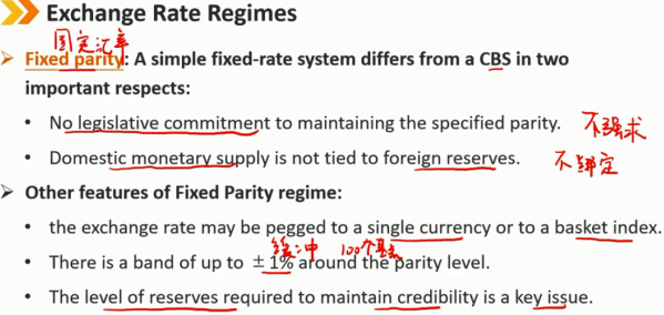 固定汇率:简单的固定汇率体系在两个重要方面不同于CBS 不是法制强制要求保持固定汇率,也不是强制要求跟某一个货币保持固定,可以更改保持固定汇率的货币 国内货币供应量不再与外汇储备绑定 固定汇率制度的其他特点: 汇率可以与单一货币挂钩,也可以与一篮子货币形成的指数挂钩 在固定水平周围有一个高达±1%的浮动缓冲区 外汇储备量是维持信誉所需的一个关键因素