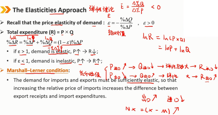 回想一下,需求的价格弹性:ε = - %△Q/%△P, ε>0 总支出(R)= P × Q %△R = %△P + %△Q =(1-ε)%△P ・如果ε>1,需求是弹性的,P↑→R↓ ・如果ε<1,需求是非弹性的,P↑→R↑ 马歇尔·勒纳条件: 进出口需求必须具有足够的弹性,以便提高进口的相对价格,增加出口收入和进口支出之间的差额 本国货币贬值,相当于进口价格增长,进口需求量下降,在弹性足够大的时候,进口支出下降;出口价格相当于下降,出口需求量增长,出口收入增长,从而净出口增长