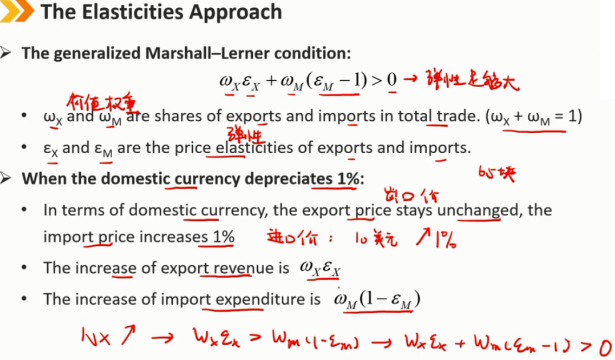 广义马歇尔-勒纳条件: ωxεx + ωm(εm-1)> 0 ωx和ωm是出口和进口在总贸易中的份额。(ωx+ωm=1) εx和εm是出口和进口的价格弹性 当本币贬值1%时: 以本币计算,出口价格不变,进口价格上涨1% 出口收入的增长是ωxεx 进口支出增加ωm(1-εm)