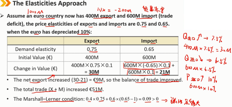 假设一个欧元国家现在有4亿出口和6亿进口(贸易逆差),出口和进口的价格弹性分别为0.75和0.65。当欧元贬值10%时: 出口会增长,400 × 0.75 × 0.1 = 30 进口会减少:600 × (-0.65)× 0.1 = -39 本币贬值,原先以外币结算的进口货物无形中增值:600 × 10% = 60 进口货物总价值变化为:-39 + 60 = 21 净出口增加(30-21)= 9,因此贸易平衡得到改善 总贸易额(X+M)增加了51 马歇尔-勒纳条件:0.4×0.75 + 0.6×(0.65-1)= 0.09 > 0