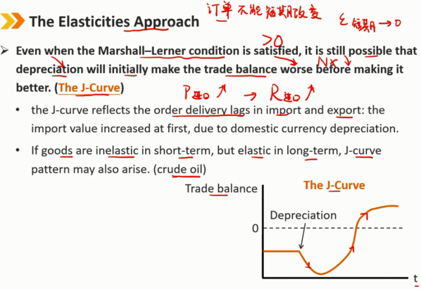 J曲线反映了进出口中订单交付的滞后:由于本币贬值,进口价值首先增加,出口价值暂时不变,随时间推移会逐渐增加