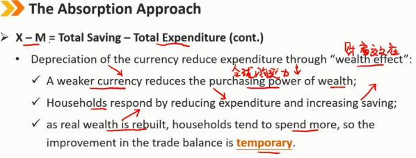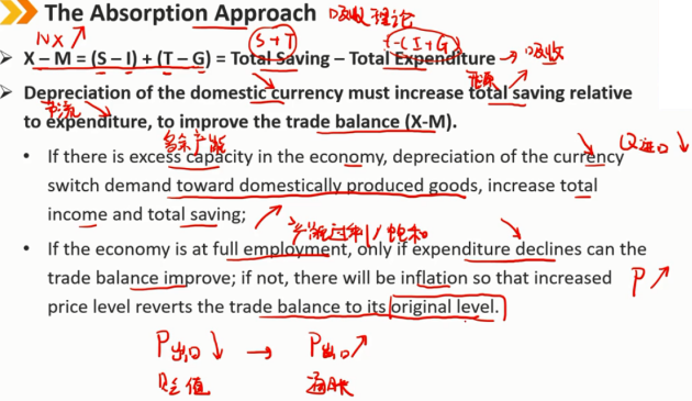 X-M =(S-I)+(T-G)= 总储蓄 - 总支出 本币贬值必须提高总储蓄相对于支出的比例,以改善贸易平衡(X-M) 如果国内经济有多余产能,产能未充分利用,货币贬值进口减少,会将需求转向国内生产的商品,增加总收入和总储蓄 如果经济处于充分就业状态,产能饱和,只有支出下降,贸易平衡才能改善;否则,就会出现通货膨胀(本币贬值进口减少,本地需求又导致价格上涨,出现通货膨胀),从而使价格水平的上升将贸易平衡恢复到原来贬值之前的水平